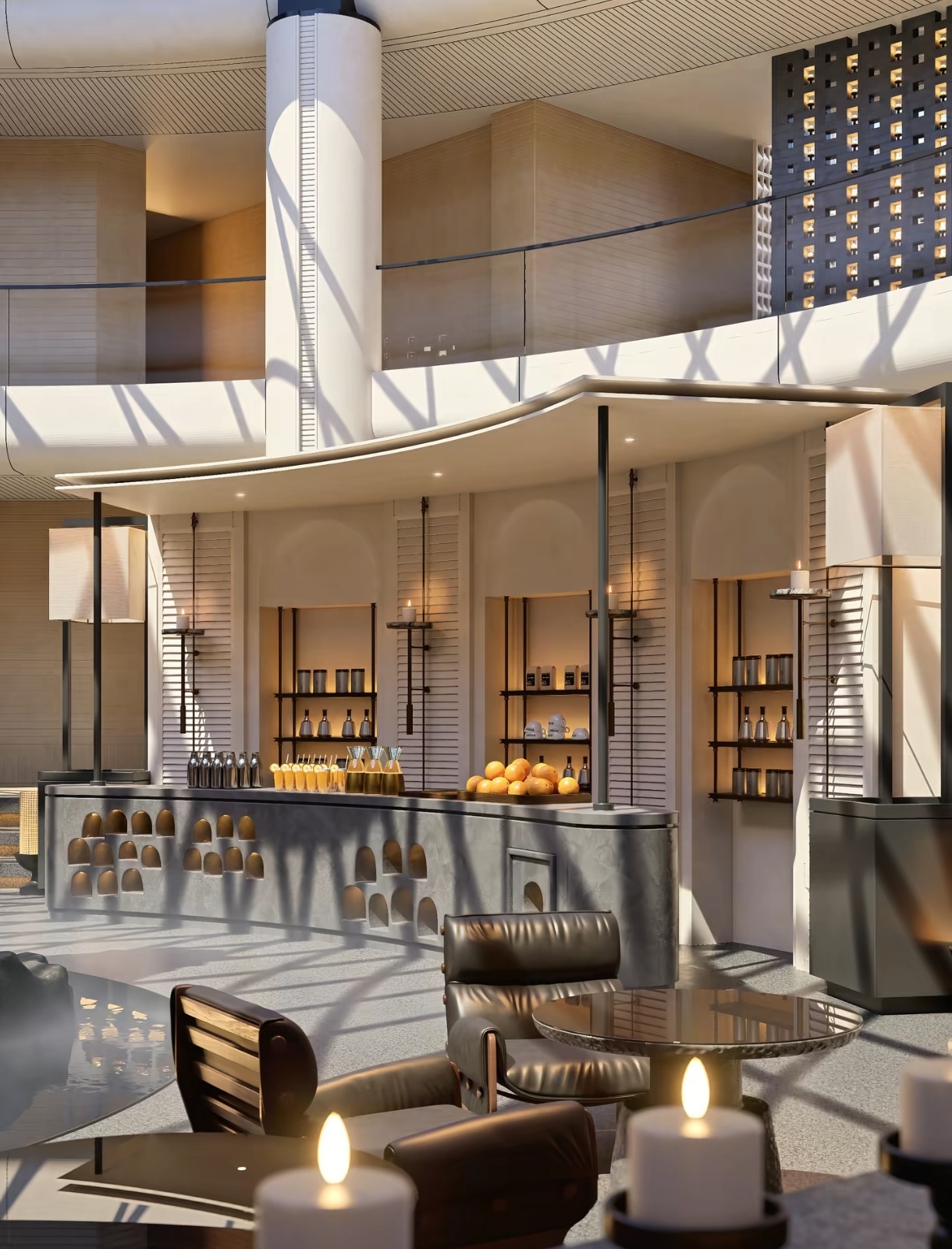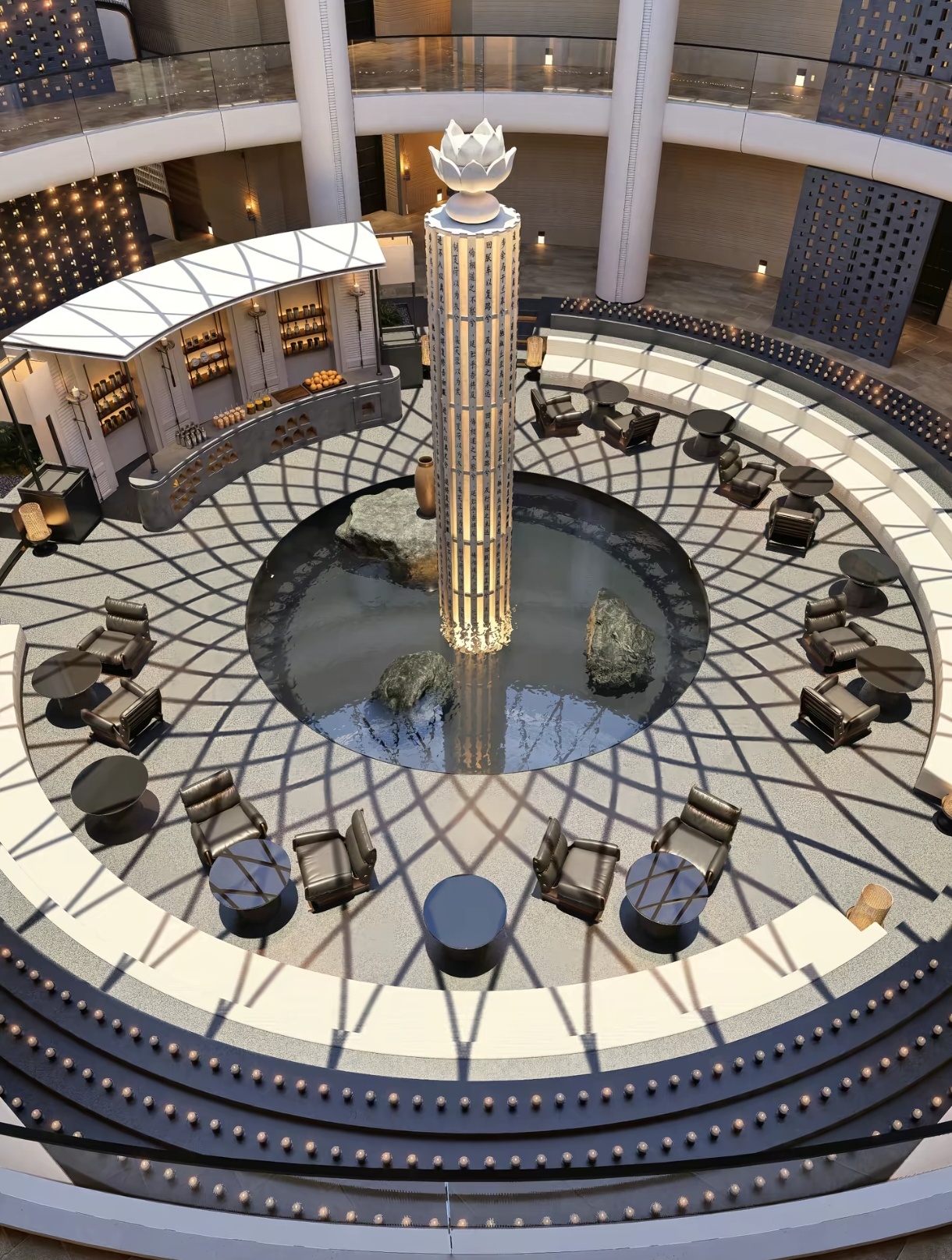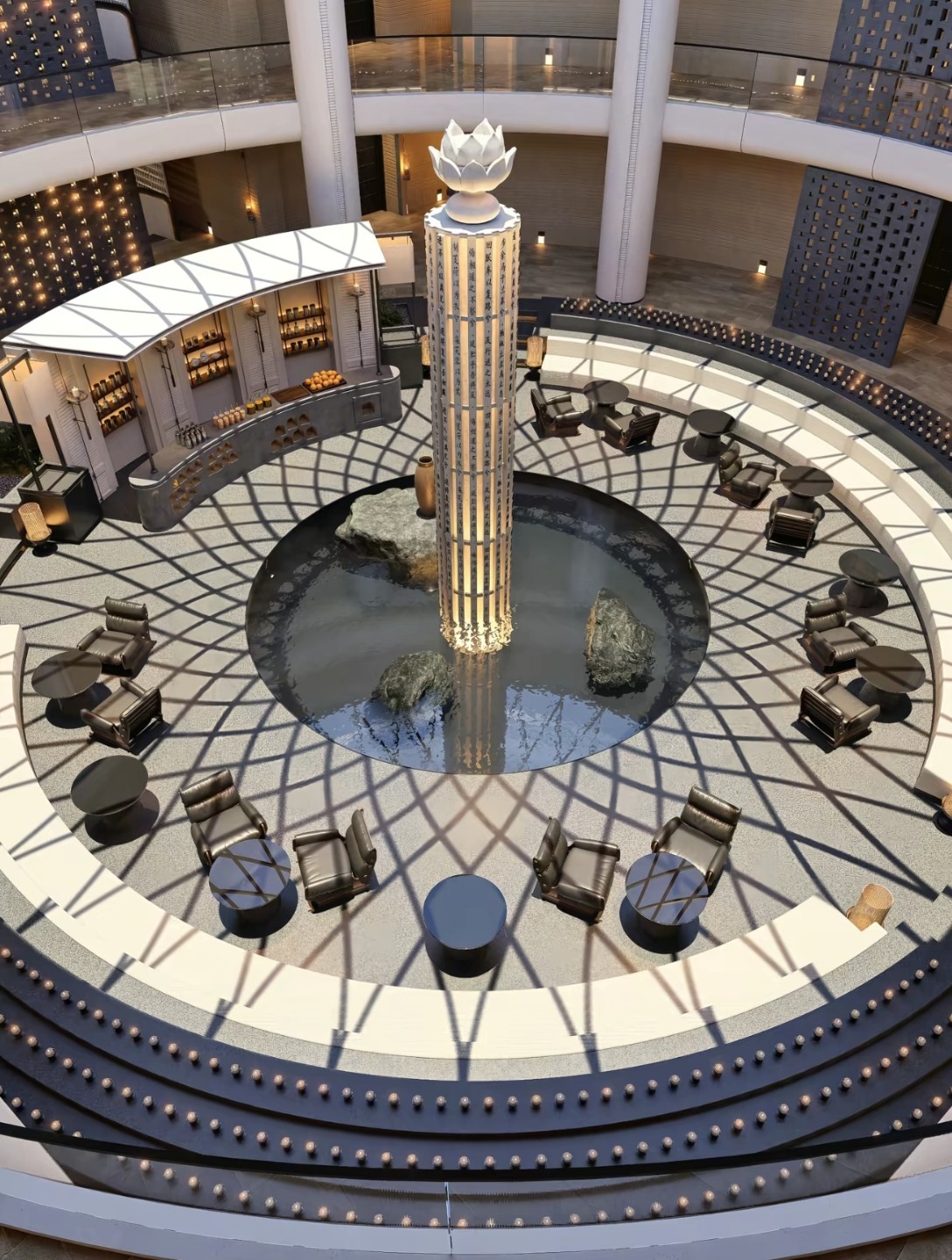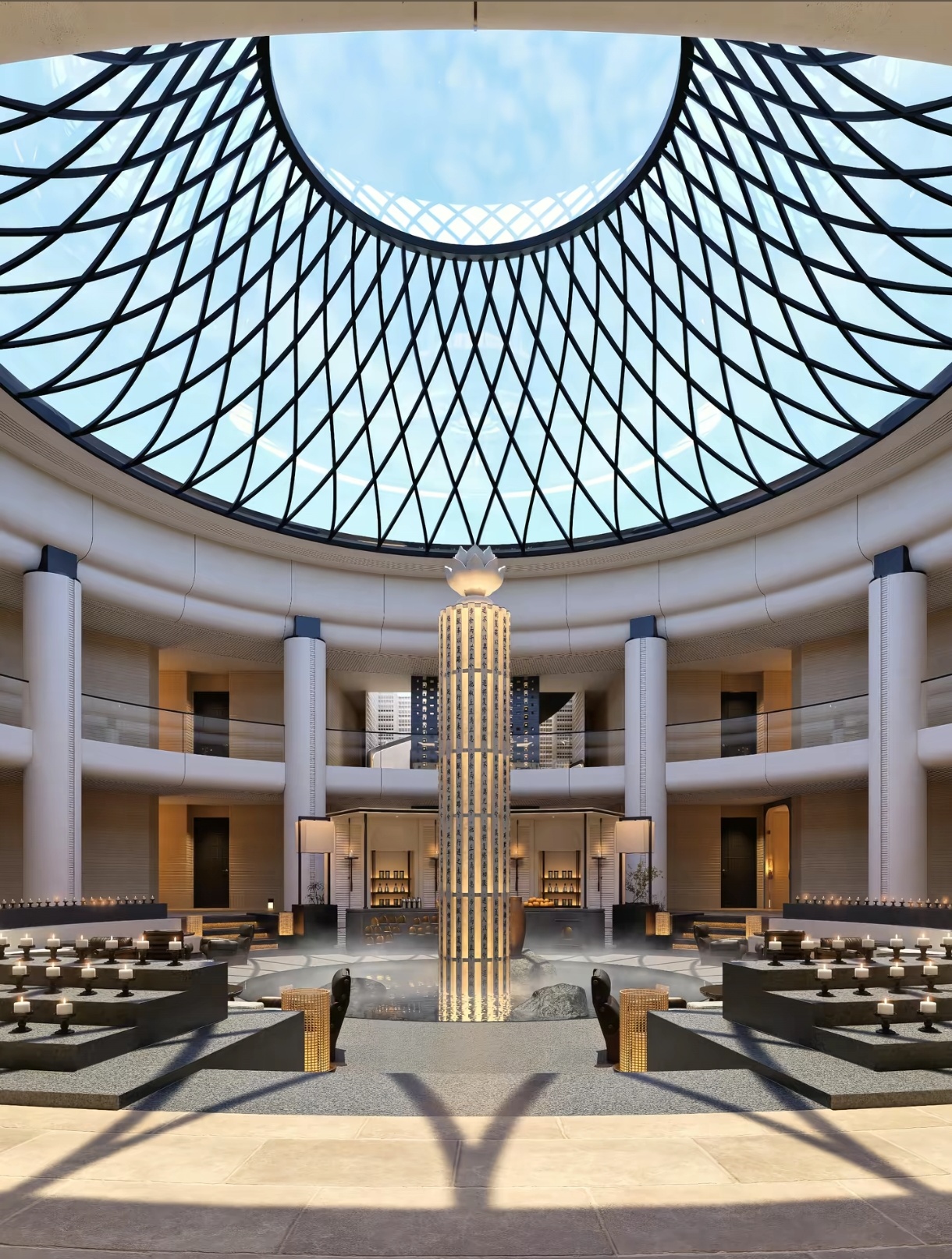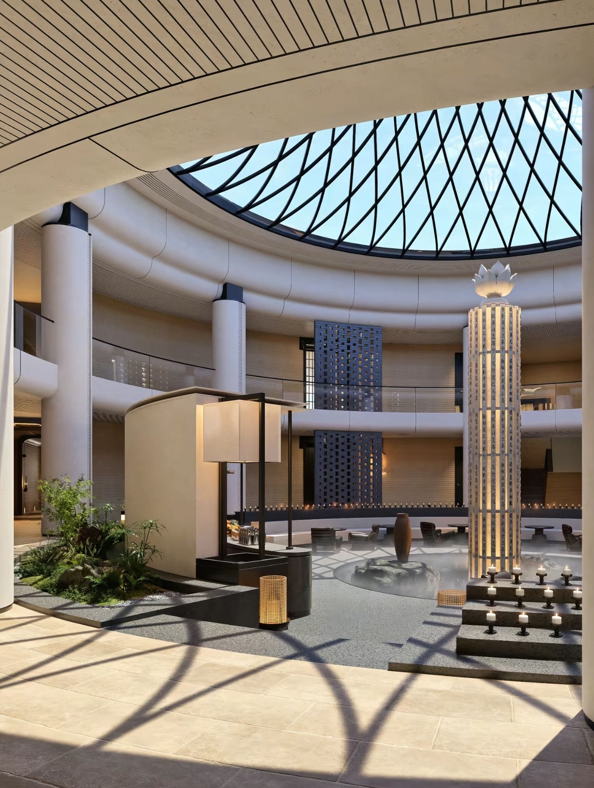 以「水、光、石、木」為核心元素,將東方禪意融入現代商業的材質與形態中,讓「奢華」以「靜謐隱奢」的方式呈現,既滿足商務的高端屬性,又承載文化體驗的鬆弛感。
