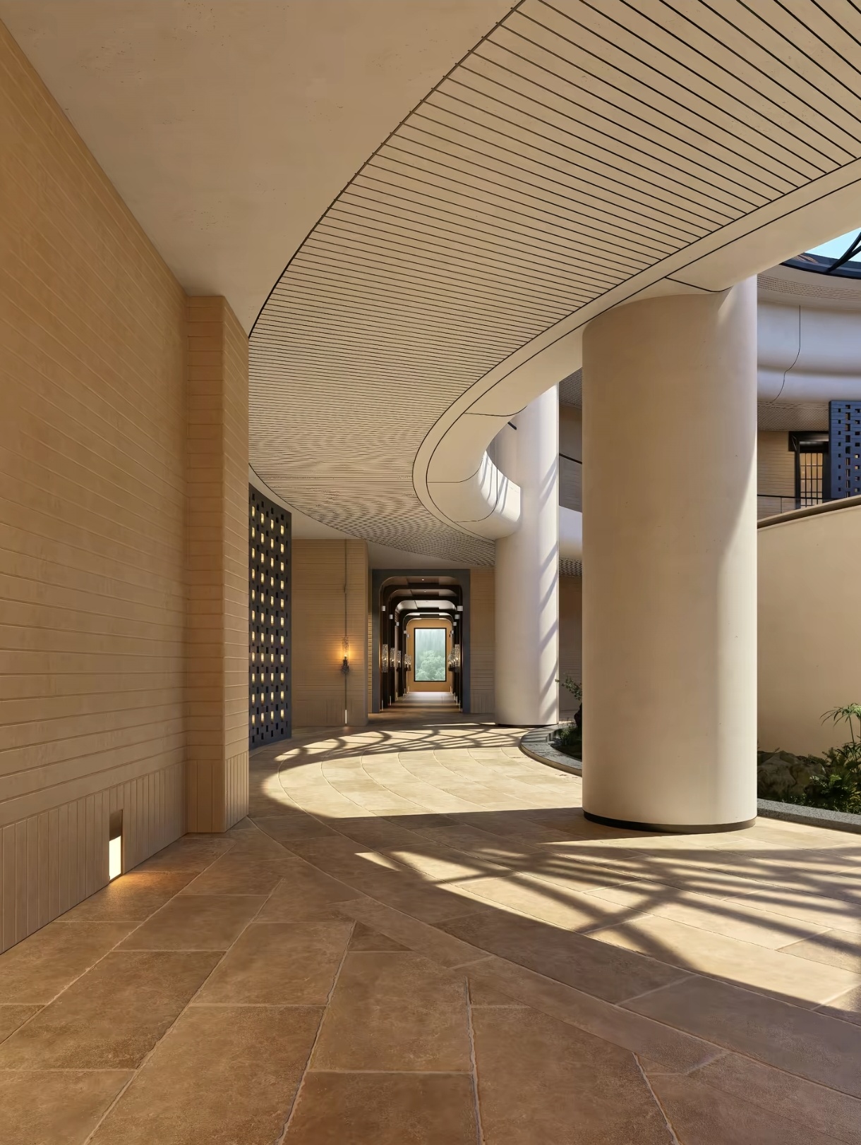 以「水、光、石、木」為核心元素,將東方禪意融入現代商業的材質與形態中,讓「奢華」以「靜謐隱奢」的方式呈現,既滿足商務的高端屬性,又承載文化體驗的鬆弛感。
